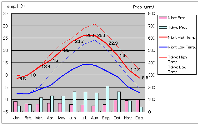 ヌーヴェル=アキテーヌ地域圏(旧ポワトゥー=シャラント地方)ニオール月別気温(Temperature & Precipitation of Niort, Deux-Sevres, Nouvelle-Aquitaine, France)