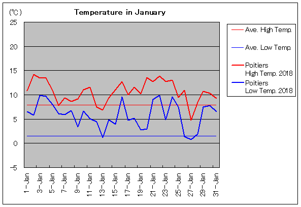 | 月日 | 平均気温 最高 / 最低 | 2018年1月 最高 / 最低 | 降水量 | 月日 | 平均気温 最高 / 最低 | 2018年1月 最高 / 最低 | 降水量 |