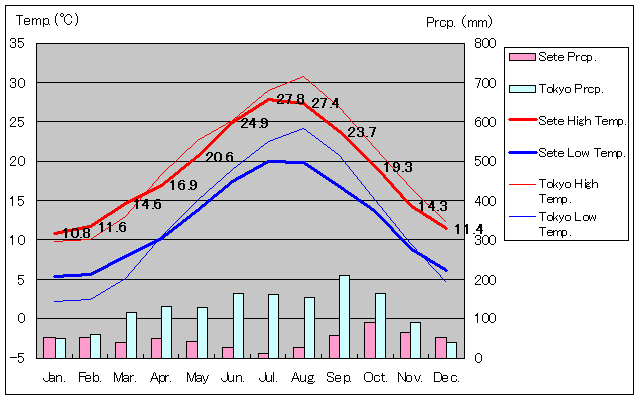 | 平均最高気温(℃) | 10.8 | 11.6 | 14.6 | 16.9 | 20.6 | 24.9 | 27.8 | 27.4 | 23.7 | 19.3 | 14.3 | 11.4 |