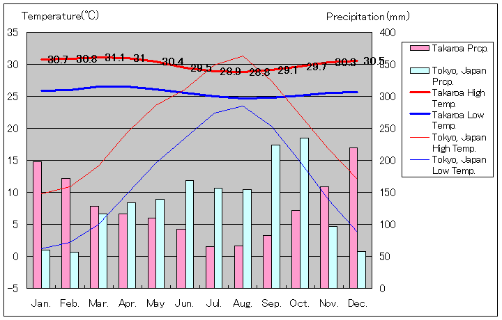 | 平均最高気温(℃) | 30.7 | 30.8 | 31.1 | 31.0 | 30.4 | 29.5 | 28.9 | 28.8 | 29.1 | 29.7 | 30.3 | 30.5 |