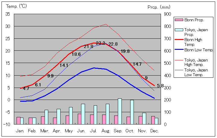 ノルトライン=ヴェストファーレン州ボンと東京の気温および降水量グラフ(1971年から2010年までの平均値)