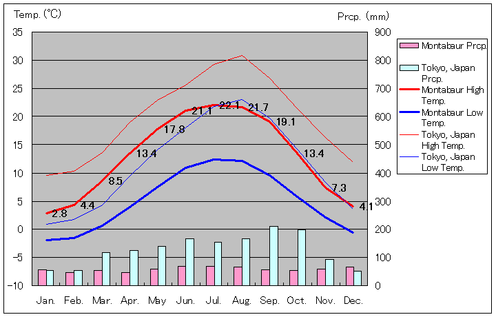 ラインラント=プファルツ州モンタバウアーと東京の気温および降水量グラフ
