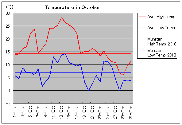 | 10月5日 | 14.3 / 6.9 | 22.2 / 7.0 | 0 | 10月20日 | 14.3 / 6.9 | 15.0 / -0.2 | 0 |