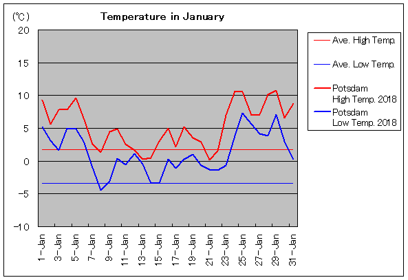 | 月日 | 平均気温 最高 / 最低 | 2018年1月 最高 / 最低 | 降水量 | 月日 | 平均気温 最高 / 最低 | 2018年1月 最高 / 最低 | 降水量 |