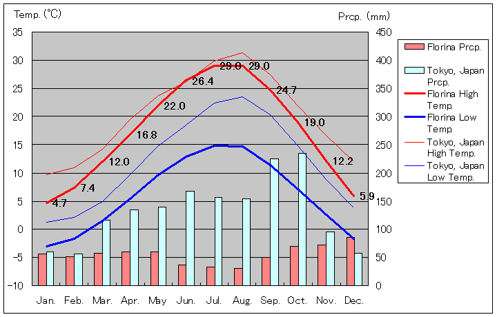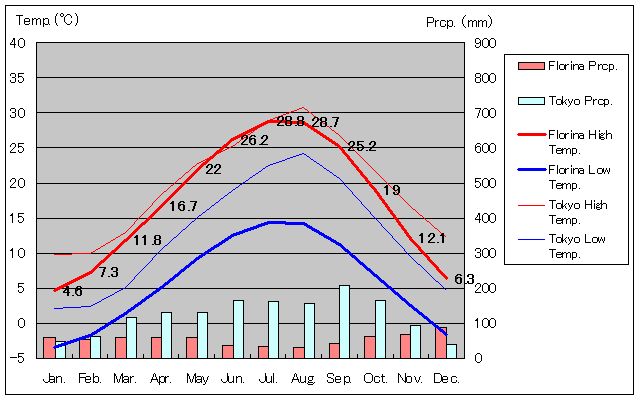 フロリナと東京の気温および降水量グラフ