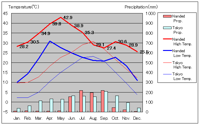 | 平均最高気温(℃) | 28.2 | 30.5 | 34.9 | 39.8 | 42.9 | 38.9 | 35.3 | 29.1 | 27.4 | 30.6 | 28.9 | 25.5 |