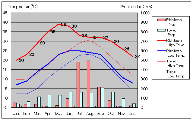 リシケーシュ月別気温(Temperature & Precipitation of Rishikesh, India)