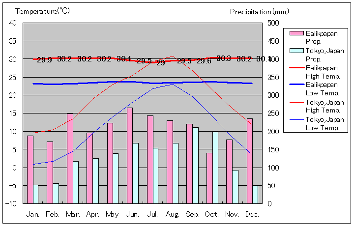 バリクパパンと東京の気温および降水量グラフ(1991年から2020年までの平均値)