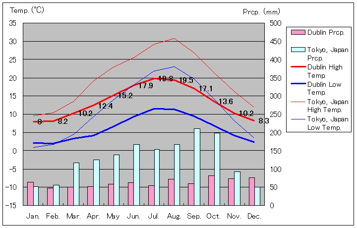 レンスター地方ダブリンと東京の気温と降水量グラフ(1991年から2020年までの平均値)、ダブリン空港の気象観測データ