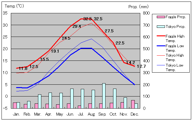 プーリア州フォッジャ月別気温(Temperature & Precipitation of Foggia, Puglia, Italy):フォッジャ県の県都、プーリア州で3番目に人口の多い都市(人口 153,004人 = 2013年11月30日現在)