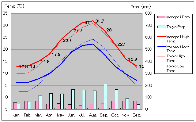 プーリア州モノーポリ月別気温(Temperature & Precipitation of Monopoli, Puglia, Italy)