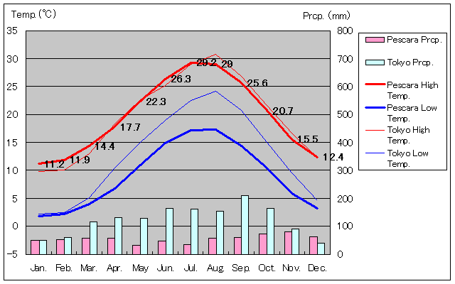 ペスカラの年間平均気温 14.4℃、年間平均最高気温 19.7℃、年間平均最低気温 9.1℃、年間降水量 658ミリメートル、年間降水日数 73日