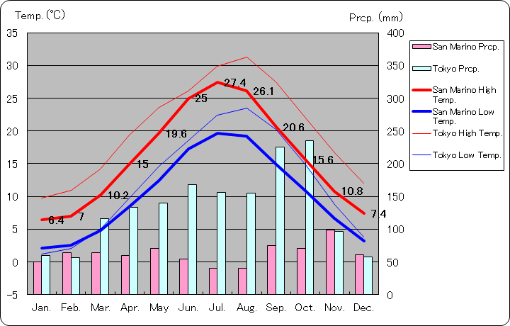 サンマリノと東京の気温と降水量グラフ