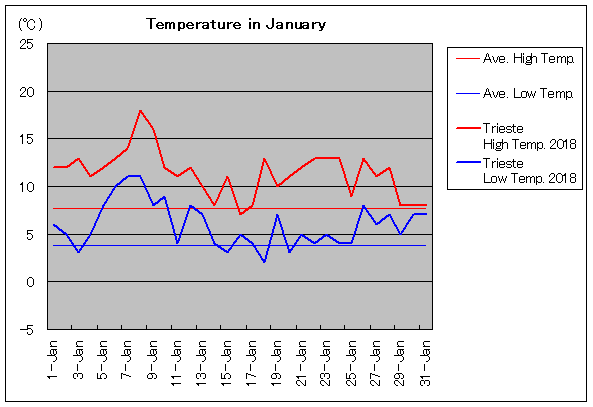 | 月日 | 平均気温 最高 / 最低 | 2018年1月 最高 / 最低 | 降水量 | 月日 | 平均気温 最高 / 最低 | 2018年1月 最高 / 最低 | 降水量 |