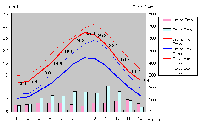 ウルビーノの年間平均気温 12.2℃、年間平均最高気温 16.2℃、年間平均最低気温 8.2℃、年間降水量 814ミリメートル