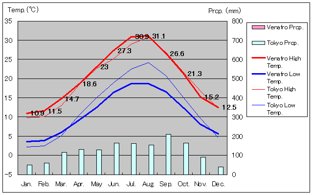 ヴェナフロの年間平均気温 15.6℃、年間平均最高気温 20.3℃、年間平均最低気温 10.9℃、1961年から1990年まで30年間の平均値