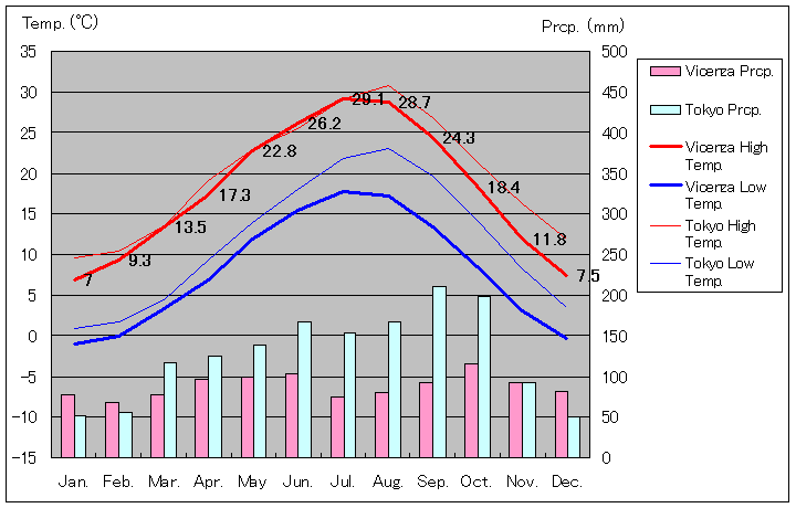 ヴィチェンツァの年間平均気温 13.3℃、年間平均最高気温 18.5℃、年間平均最低気温 8.2℃、年間降水量 1,060ミリメートル、年間降水日数 88日、1981年から2010年まで30年間の平均値、過去最高・最低気温は1951年から2008年までの極値、降水は1971年から2000年、相対湿度は1961年から1990年、「Istituto Superiore per la Protezione e la Ricerca Ambientale」データ、イタリア気象局(Servizio Meteorologico)データ