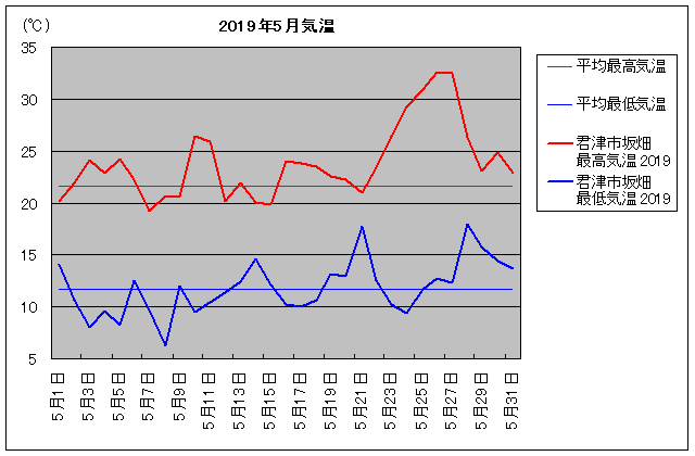 | 月日 | 平均気温 最高 / 最低 | 2019年5月 最高 / 最低 | 降水量 | 月日 | 平均気温 最高 / 最低 | 2019年5月 最高 / 最低 | 降水量 |