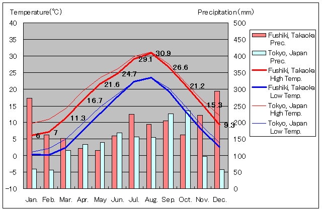 | 平均最高気温(℃) | 6.0 | 7.0 | 11.3 | 16.7 | 21.6 | 24.7 | 29.1 | 30.9 | 26.6 | 21.2 | 15.3 | 9.3 |