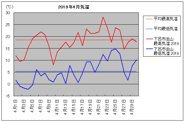 | 月日 | 平均気温 最高 / 最低 | 2019年4月 最高 / 最低 | 降水量 | 月日 | 平均気温 最高 / 最低 | 2019年4月 最高 / 最低 | 降水量 |