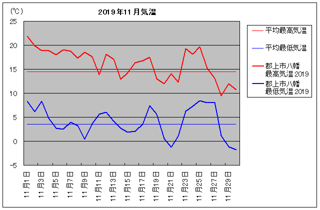 | 月日 | 平均気温 最高 / 最低 | 2019年11月 最高 / 最低 | 降水量 | 月日 | 平均気温 最高 / 最低 | 2019年11月 最高 / 最低 | 降水量 |