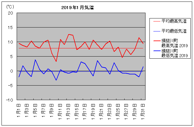 | 月日 | 平均気温 最高 / 最低 | 2019年1月 最高 / 最低 | 降水量 | 月日 | 平均気温 最高 / 最低 | 2019年1月 最高 / 最低 | 降水量 |