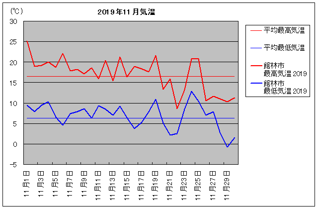 | 月日 | 平均気温 最高 / 最低 | 2019年11月 最高 / 最低 | 降水量 | 月日 | 平均気温 最高 / 最低 | 2019年11月 最高 / 最低 | 降水量 |