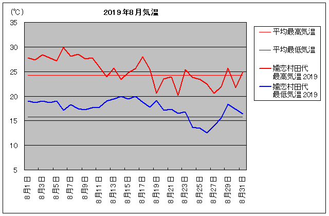 | 月日 | 平均気温 最高 / 最低 | 2019年8月 最高 / 最低 | 降水量 | 月日 | 平均気温 最高 / 最低 | 2019年8月 最高 / 最低 | 降水量 |