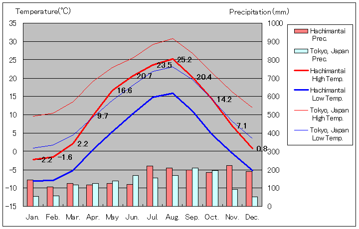 岩手県・秋田県 八幡平月別気温(Temperature & Precipitation of Hachimantai, Iwate and Akita):標高 578メートル