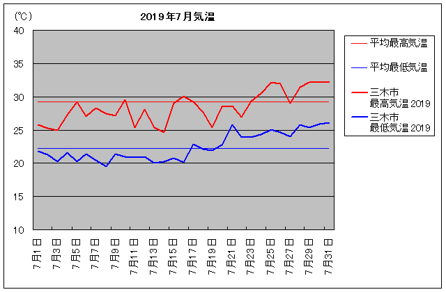 | 月日 | 平均気温 最高 / 最低 | 2019年7月 最高 / 最低 | 降水量 | 月日 | 平均気温 最高 / 最低 | 2019年7月 最高 / 最低 | 降水量 |