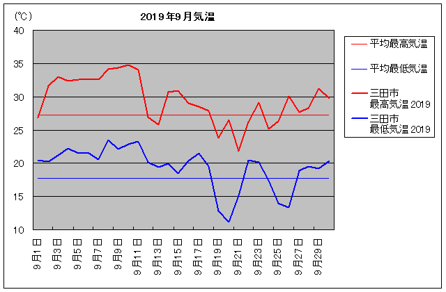 | 月日 | 平均気温 最高 / 最低 | 2019年9月 最高 / 最低 | 降水量 | 月日 | 平均気温 最高 / 最低 | 2019年9月 最高 / 最低 | 降水量 |