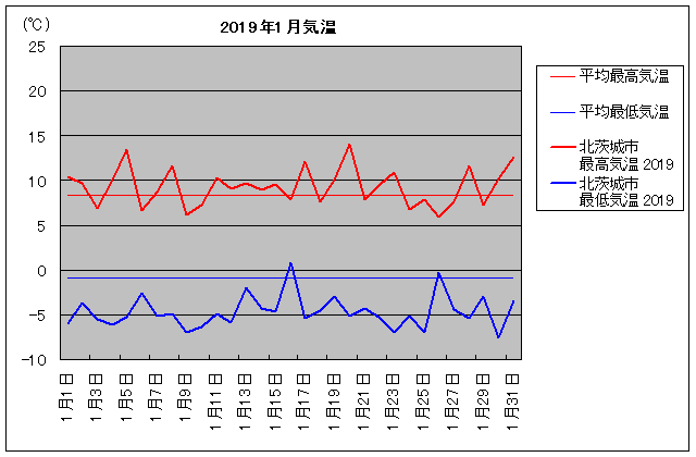 | 月日 | 平均気温 最高 / 最低 | 2019年1月 最高 / 最低 | 降水量 | 月日 | 平均気温 最高 / 最低 | 2019年1月 最高 / 最低 | 降水量 |