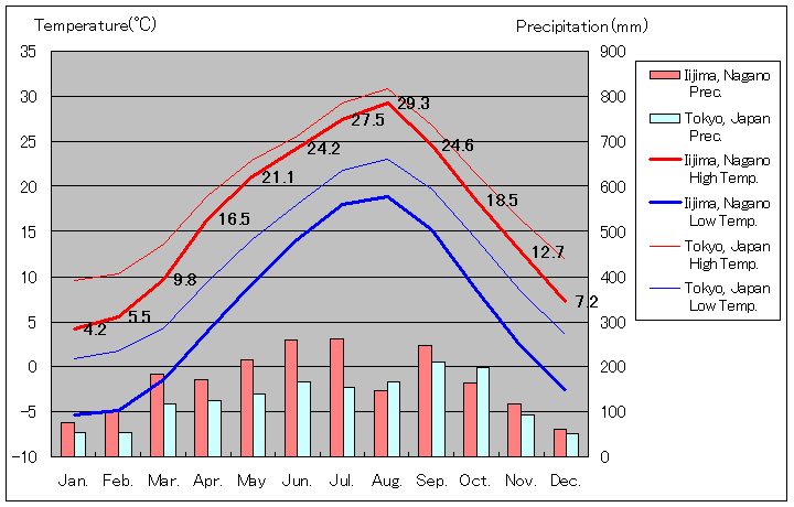 1981年から2010年まで30年間の平均値、長野県飯島町と東京の気温および降水量グラフ