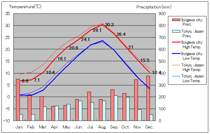 新潟県 糸魚川市月別気温(Temperature & Precipitation of Itoigawa City, Niigata Prefecture, Japan)、標高 8メートル