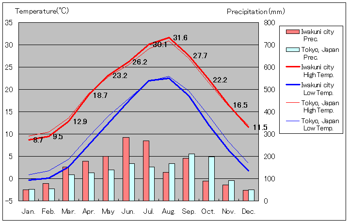 1981年から2010年まで30年間の平均値、岩国と東京の気温および降水量グラフ