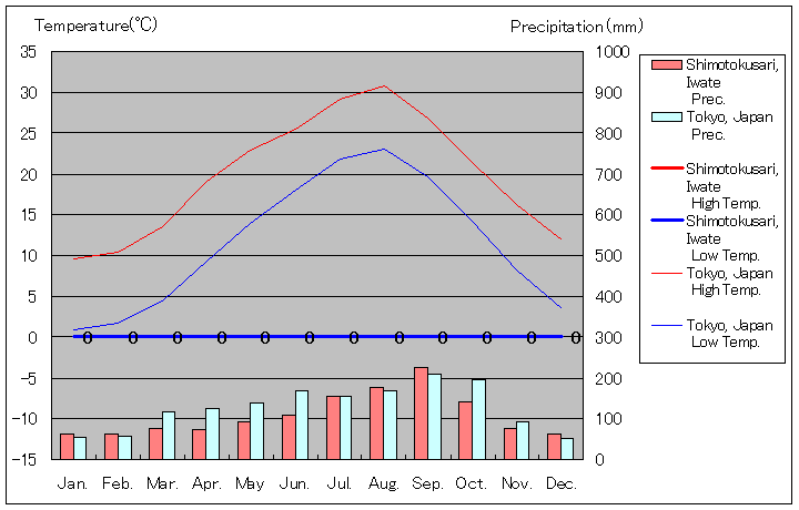 岩手県久慈市山根町 下戸鎖と東京の気温および降水量グラフ