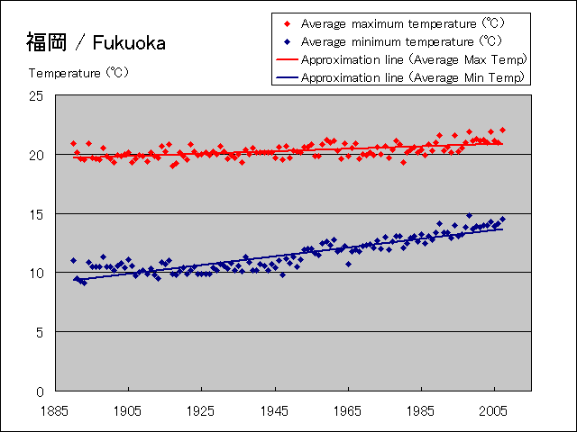 地球温暖化による福岡市の平均最高気温と平均最低気温の上昇グラフ(1890年から2007年までのデータ)
