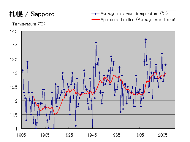 地球温暖化による札幌の平均最高気温と平均最低気温の上昇グラフ(1886年から2007年までのデータ)