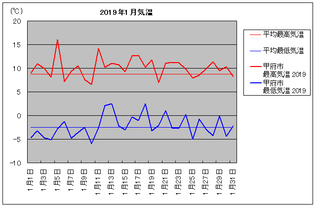 | 月日 | 平均気温 最高 / 最低 | 2019年1月 最高 / 最低 | 降水量 | 月日 | 平均気温 最高 / 最低 | 2019年1月 最高 / 最低 | 降水量 |