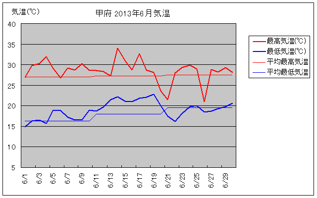 | 月日 | 2013年6月の気温(℃) 最高気温 / 最低気温 | 平均値(過去30年間) 最高気温 / 最低気温 |