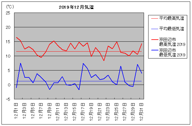 | 月日 | 平均気温 最高 / 最低 | 2019年12月 最高 / 最低 | 降水量 | 月日 | 平均気温 最高 / 最低 | 2019年12月 最高 / 最低 | 降水量 |