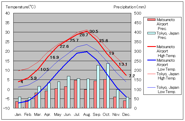 1981年から2010年まで18年間の平均値、松本今井(松本空港)と東京の気温および降水量グラフ