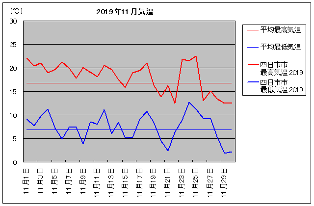 | 11月7日 | 16.7 / 6.8 | 19.9 / 7.4 | 0 | 11月22日 | 16.7 / 6.8 | 12.5 / 6.3 | 1 |
