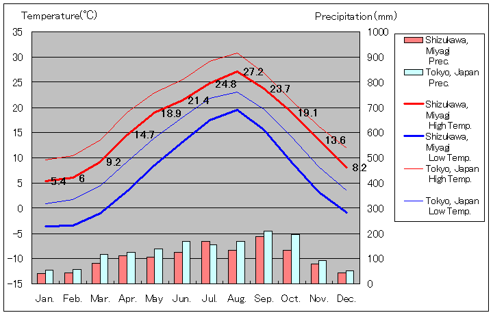 ‹{錧 –{‹gŒS“ìŽO—¤’¬Žu’Ã쌎•Ê‹C‰·iTemperature & Precipitation of Shizukawa, Minami-Sanriku Town, Motoyoshi-gun District, Miyagi Prefecture, JapanjF•W‚ 39ƒ[ƒgƒ‹