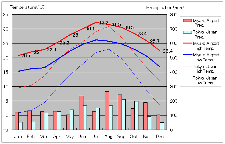 沖縄県宮古島 宮古空港と東京の気温および降水量グラフ