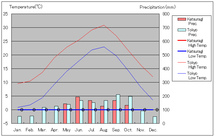 奈良県 葛城市月別気温(Temperature & Precipitation of Katsuragi City, Nara Prefecture, Japan)、標高 141メートル