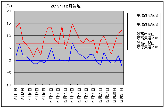 | 月日 | 平均気温 最高 / 最低 | 2019年12月 最高 / 最低 | 降水量 | 月日 | 平均気温 最高 / 最低 | 2019年12月 最高 / 最低 | 降水量 |