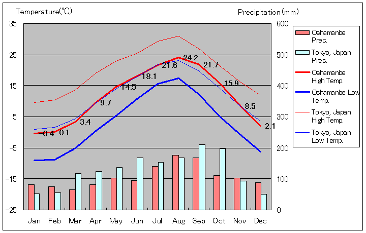 北海道長万部と東京の気温および降水量グラフ(1981年から2010年まで30年間の平均値)
