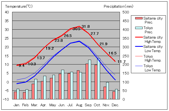 1981年から2010年まで30年間の平均値、さいたま市と東京の気温および降水量グラフ