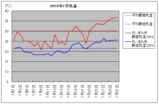 | 月日 | 平均気温 最高 / 最低 | 2019年7月 最高 / 最低 | 降水量 | 月日 | 平均気温 最高 / 最低 | 2019年7月 最高 / 最低 | 降水量 |